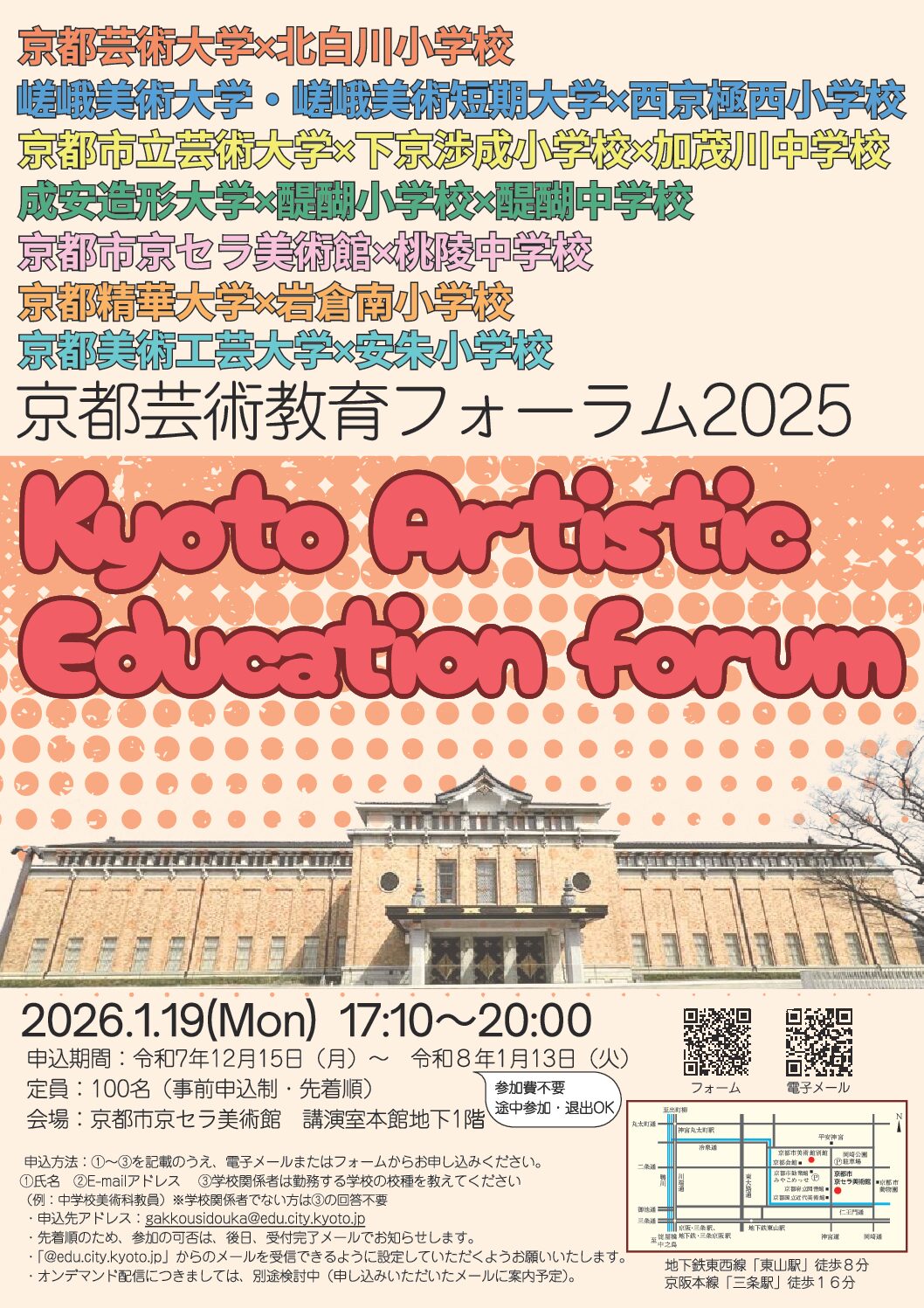 将来の予測が困難とされる時代の中、豊かな感性や想像力等を育む芸術教育の重要性は増しています。京都芸術教育コンソーシアム(Art-e Kyoto)フォーラムは、平成24年度の設立以来、今回で14回目となり、芸術教育の普及に努めてきました。今年度のフォーラムでは、芸術系大学等と小中学校の芸術教育の共同研究事例を発表します。